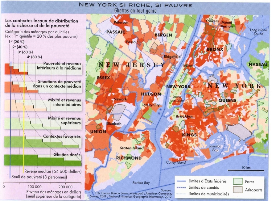 En plus d'une grande diversité ethnique et culturelle, la ville est marquée depuis toujours par de fortes disparités de richesse. Cliquez ici ou sur la carte pour l'afficher lisiblement puis observez-la pour comprendre ce qu'elle représente. Réduisez les couleurs de 6 à 3. Regardez où sont concentrées vos trois couleurs. Si vous deviez représenter cette carte sous forme de cercle en prenant Manhattan pour centre, quelle serait votre conclusion ?