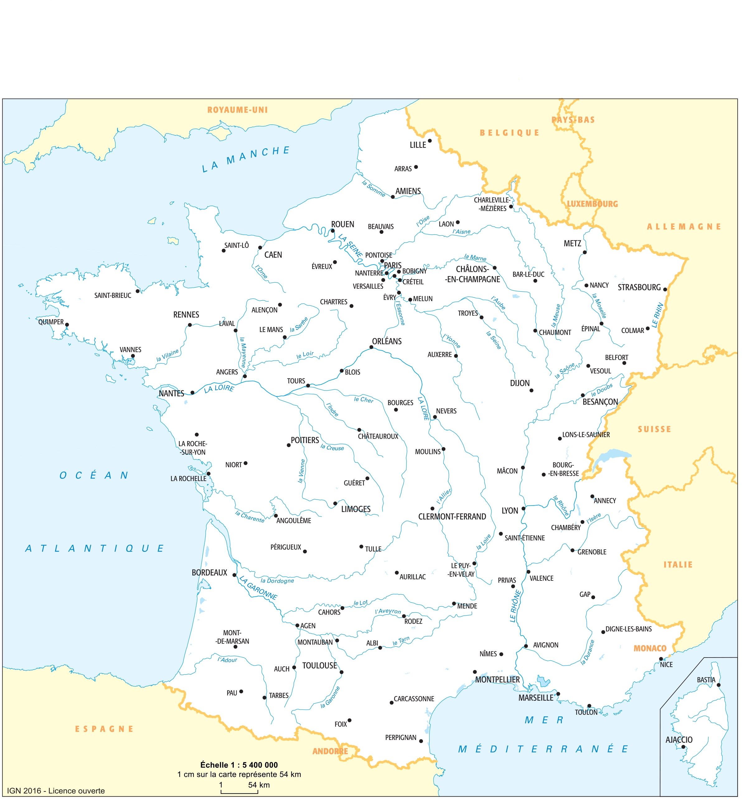 Principaux fleuves de France et préfectures.IGN20161:5 400 000.France