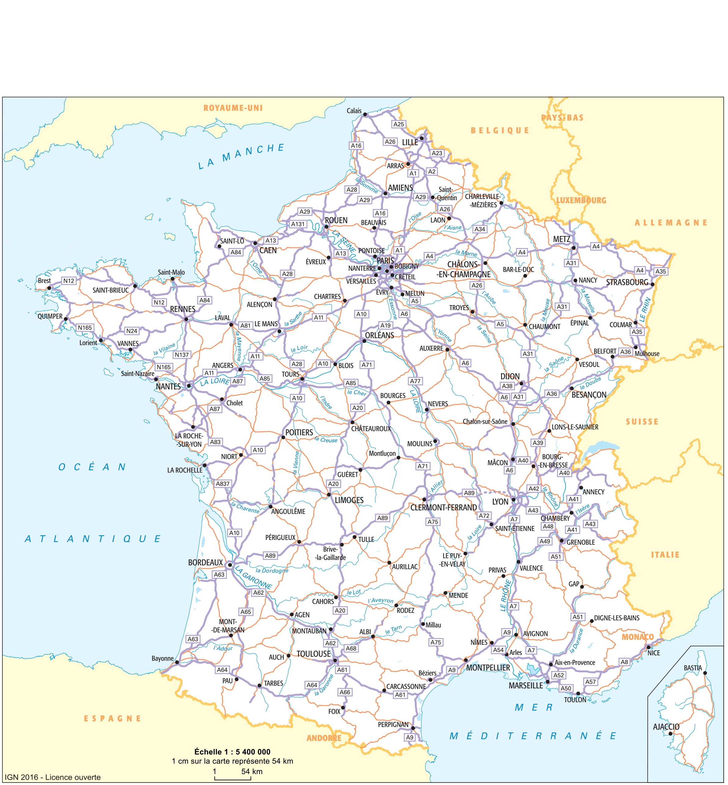 Réseau routier, autoroutier et fluvial de la France.IGN20161:5 400 000.France