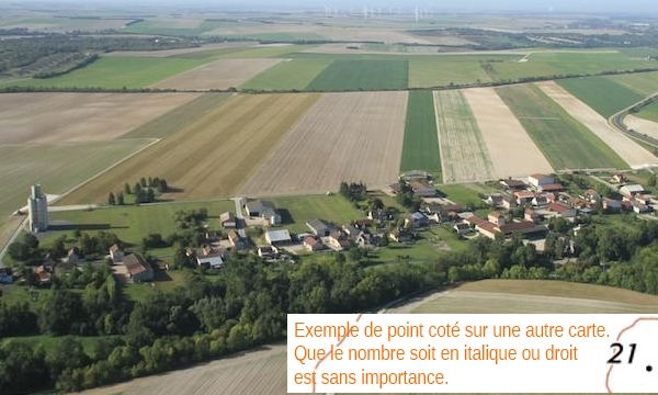Les altitudes sont indiquées par les points cotés : un point suivi d'un nombre. Examinez la carte.