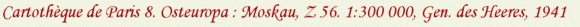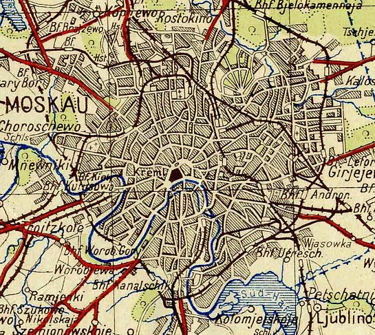 Le Kremlin est indiqué au centre de la ville comme la ville est au centre des routes (en rouge) convergeant vers elle. L'image de la cible à atteindre est forte. Mais cette carte est reprise d'une carte de 1918. L'impression de cible n'est donc pas créée faussement par la cartographie. Moscou, capitale, est réellement un point de convergences. Elle est aussi symbole. Hitler désirait écraser les centres économiques les uns après les autres. Son état-major a obtenu que Moscou soit visée en tant que capitale. L'armée a divisé ses forces et échoué sur Léningrad puis sur Moscou.
